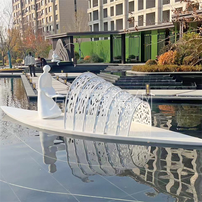 这款雕塑摒弃了刻板的写实风格,采用仿真抽象人物+船型的创意组合,既保留了人物的灵动神韵,又以流畅的船体线条营造出诗意氛围。抽象化的设计简约大气,不会显得浮夸突兀,既能适配现代简约风小区,也能融入中式、欧式等多种建筑风格,摆放在小区入口、中心广场、景观湖畔、休闲步道等位置,瞬间成为视觉焦点。