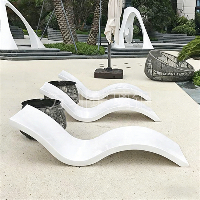 岸上款躺椅适合放置于泳池边的硬质平台、景观沙滩区、户外休息区等非泡水场景,尤其适合预算有限、追求高性价比的项目。其优势在于制作周期短、成本可控,同时造型与质感不打折扣,既能满足客户对颜值的要求,也能适配大部分常规户外场景的使用需求,是社区泳池、商业广场水景、度假酒店露台等场景的高性价比选择。